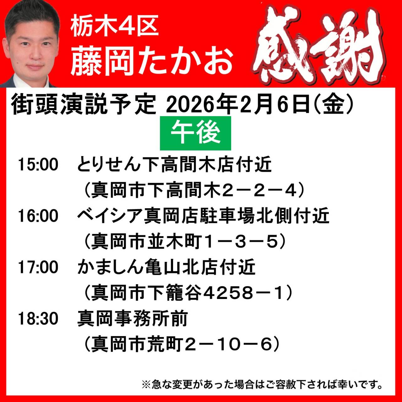 2月6日(金)街頭演説等日程のお知らせ