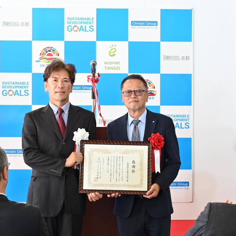 今回は、念願であったエネルギーの地産地消を大きく進めるローカルエネルギープロジェクトの立ち上げ、そしてNPOだけでは成し得なかったバイオ燃料プラント建設に御尽力頂きました大西衛生様に感謝状を贈呈させて頂きました。