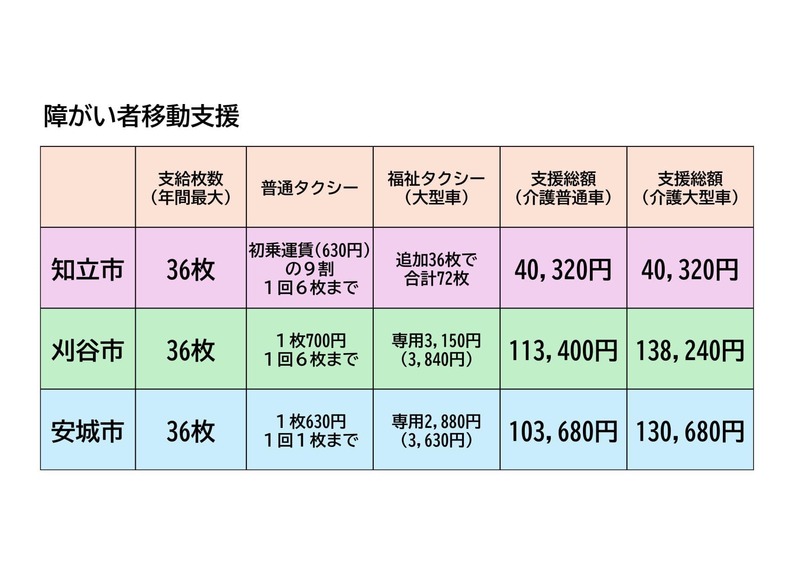 特に、4月1日より改正施行される、障害者差別解消法、障害者総合支援法を受けて、この機会に市の障がい者施策について、近隣市と比較しながら、知立市の施策拡充を求めました。医療的ケア児への支援や、福祉専用車両を利用した移動支援の料金設定、災害時の人工呼吸器等の非常時電源装置購入補助など、事例を掲げながら質しました(添付資料)。