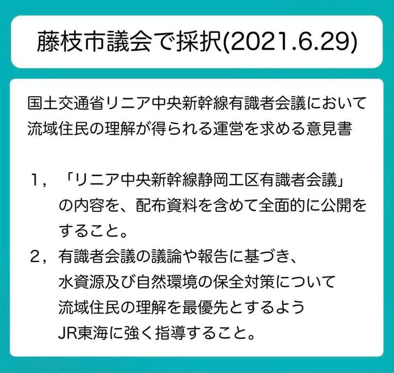 国土交通省リニア中央新幹線有識者会議において流域住民の理解が得られる運営を求める意見書が、本日藤枝市議会で採択されました.