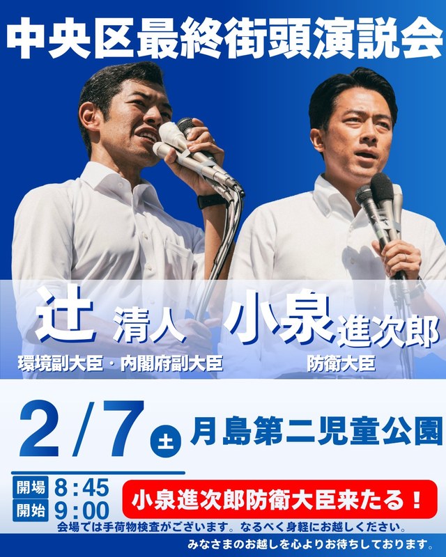ホーム>政党・政治家>辻 清人 (ツジ キヨト)>【緊急!小泉進次郎防衛大臣来たる!】2/79時(8時45分)より、月島第二児童公園にて街頭演説...