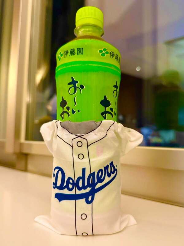 おーいお茶。 MLBユニフォーム型巾着付き。 全6種類。ドジャース買ってしまいました。保冷・保温タイプのペットボトルカバーかと思ったら巾着だったことをご報告😊