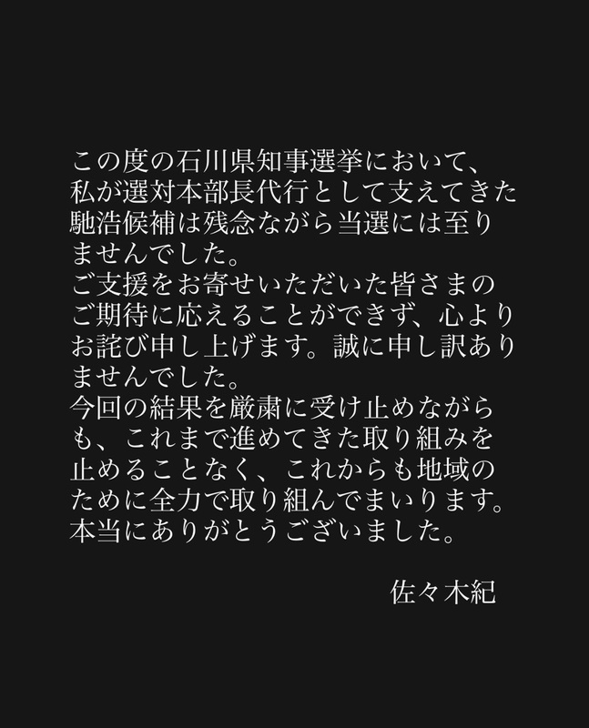 この度の石川県知事選挙において、私が選対本部長代行として支えてきた馳浩候補は残念ながら当選には至りませんでした。