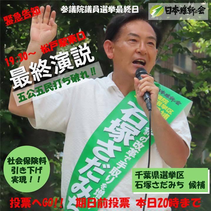 ホーム>政党・政治家>石塚 さだみち (イシヅカ サダミチ)>※【緊急告知】※拡散希望‼️石塚さだみちのマイク納めを19時半より#松戸駅東口デッキ上で行います。