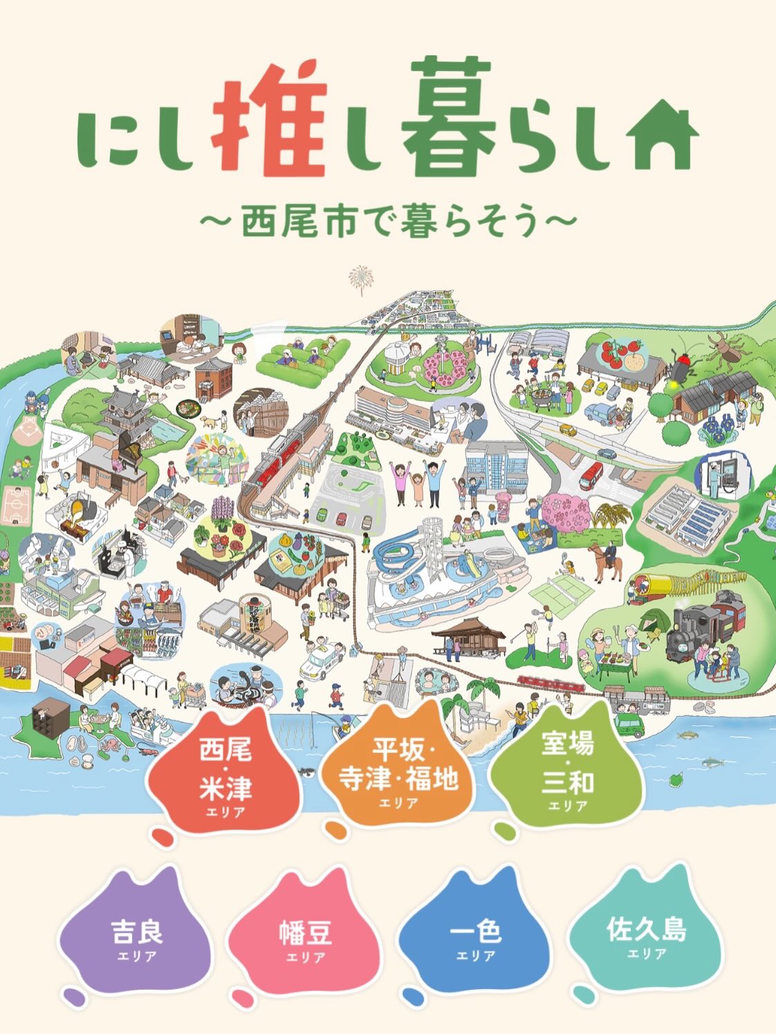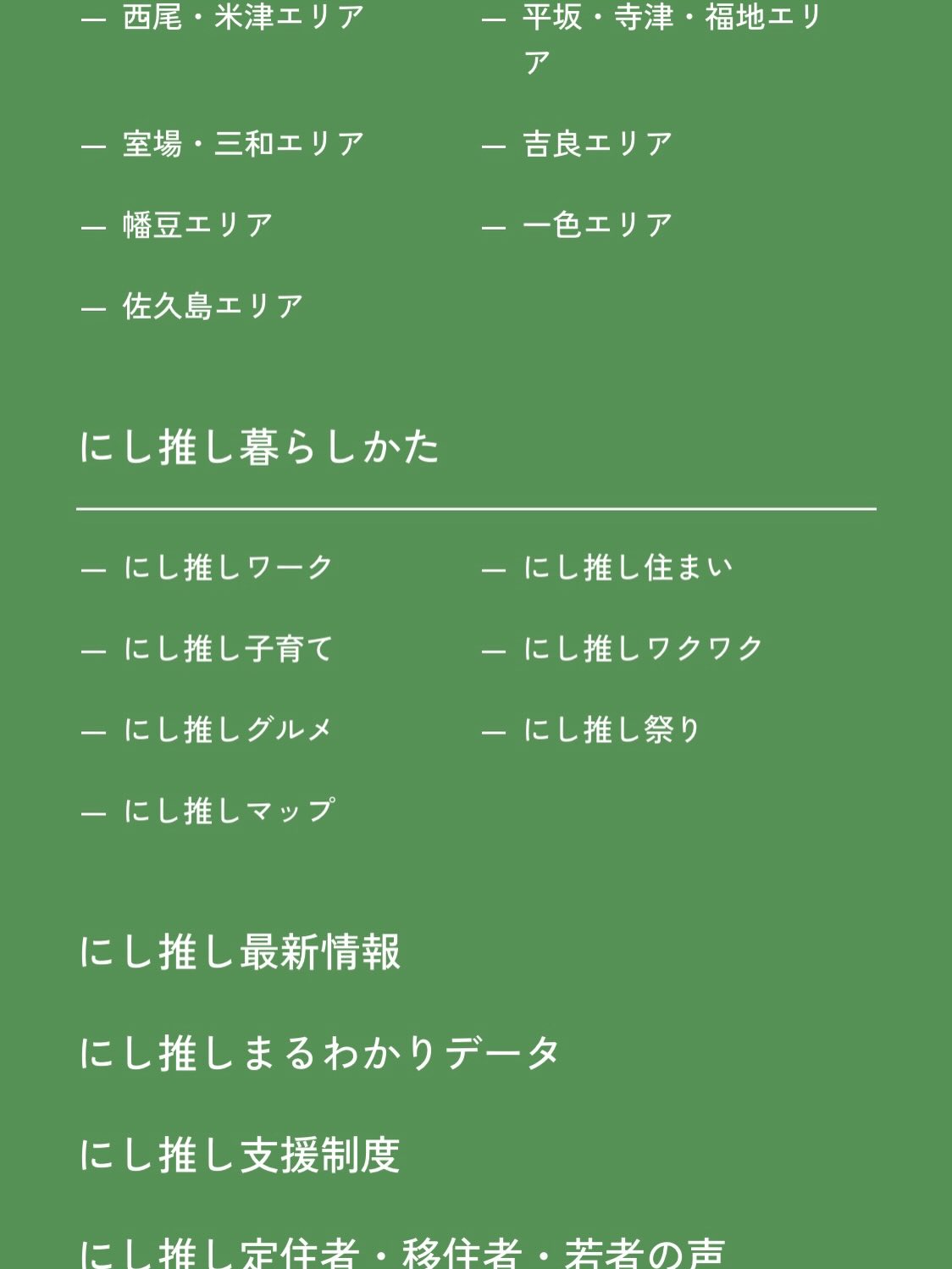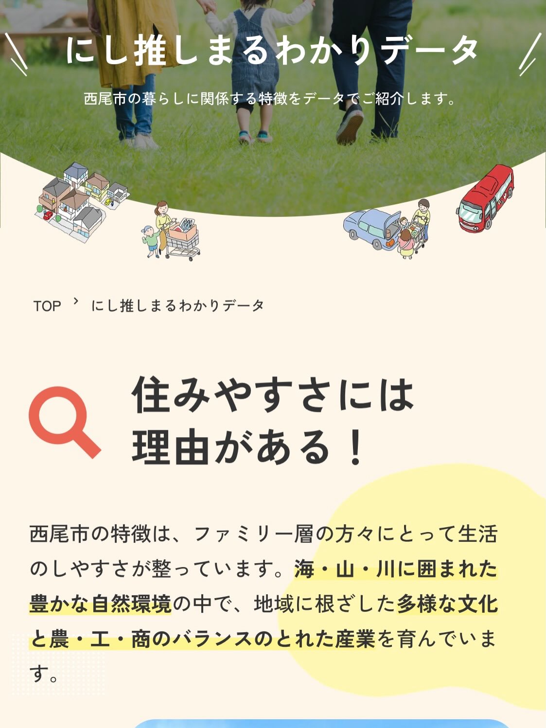 トップページをはじめ、西尾市の暮らしやすさをデータに基づいて紹介する「にし推しまるわかりデータ」 、市内を7つのエリアに分けて紹介する「にし推しエリアマップ」 、住まい・子育てなど暮らしに必要な情報をまとめた「にし推し暮らしかた」のほか、各種支援制度、定住者・移住者・若者の声、ふるさと納税の紹介などで構成しています。