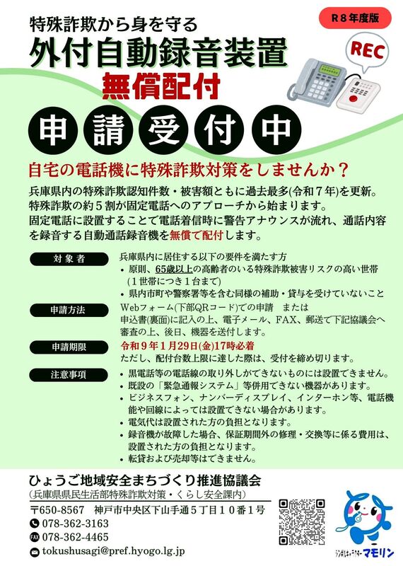対象:65歳以上の方がいる兵庫県内の世帯(1世帯1台まで)、過去に電話機購入補助等、特殊詐欺対策の同様の補助・貸付を受けていないこと。