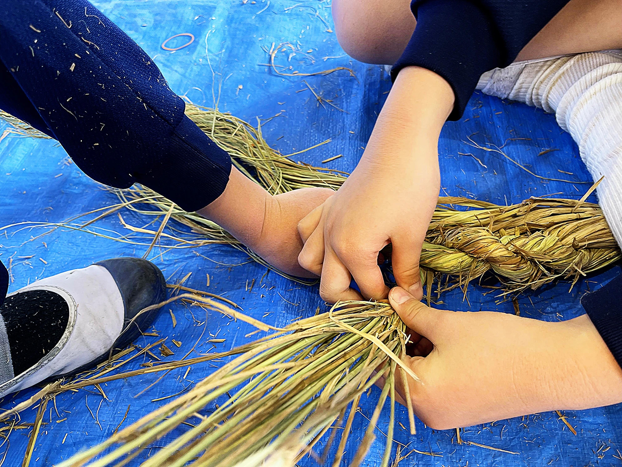 子ども達は、藁の感触を確かめながら、やはり最初は上手く出来ない様子でしたが、二人一組で協力しながら、自分達のしめ縄を、しっかりとしめ縄をなう姿が印象的でした。