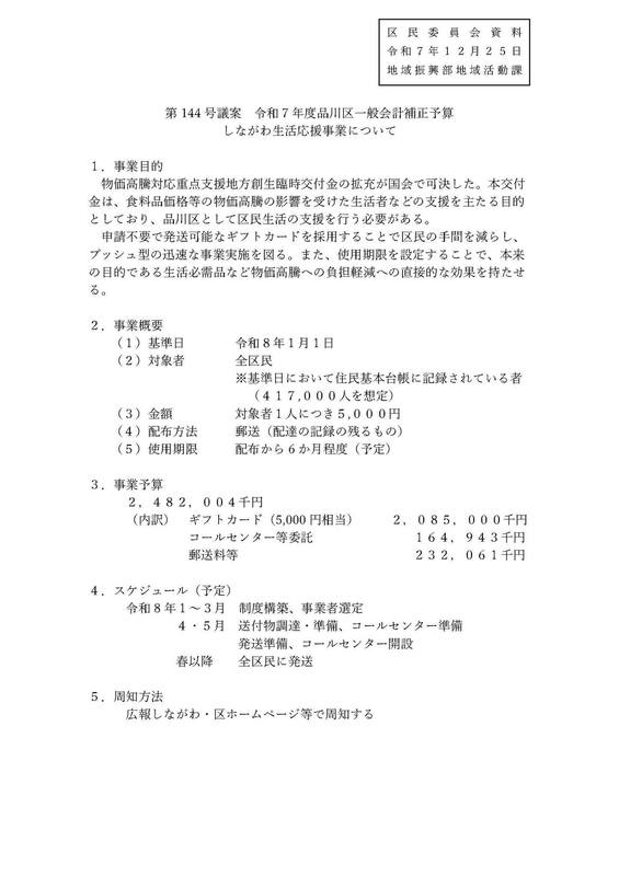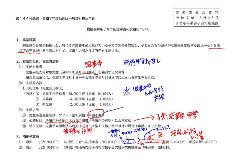 遅くなりましたが、25日に品川区議会臨時会が開催され、国の物価高対策を受けて、子育て応援手当として子ども一人当たり2万円の給付と、しながわ生活応援事業として5000円(国3000円+区上乗せ分2000円)のギフトカード給付について、審議を行い可決されました。