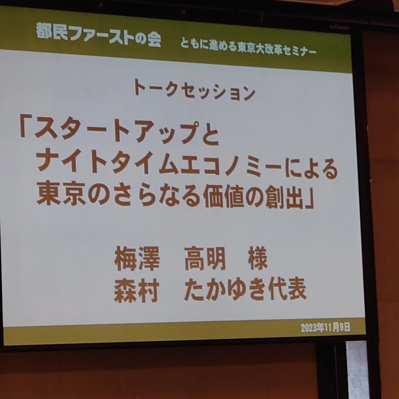 そして、私が公約で掲げており、先の品川区議会 第三回定例会で一般質問もさせて頂いた「ナイトタイムエコノミー」について、A.T.カーニー日本法人会長で、ナイトタイムエコノミー推進協議会理事の梅澤高明さんと森村代表のトークセッションも行われました❗