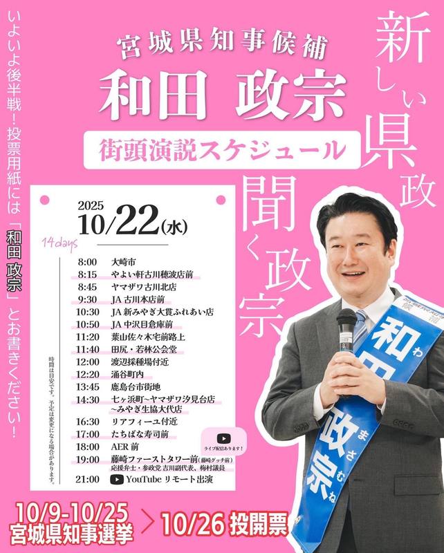 ホーム>政党・政治家>和田 政宗 (ワダ マサムネ)>宮城県知事選挙 情勢は大激戦。22日の行程