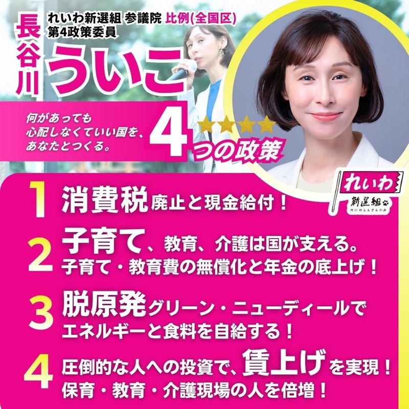 ホーム>政党・政治家>長谷川 ういこ (ハセガワ ウイコ)>長谷川ういこ4つの政策1.消費税廃止と現金給付!2.子育て、教育、介護は国が支える。