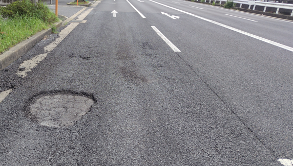 富雄北小学校付近の道路に大きな穴ぼこが空いていて危ないとの声をいただきました。