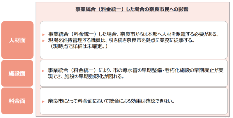私は、現時点において県域水道一体化に賛成、反対は決めておりませんので、奈良市が実施している奈良市県域水道一体化取組事業懇談会の取り組み状況をお伝えしました。