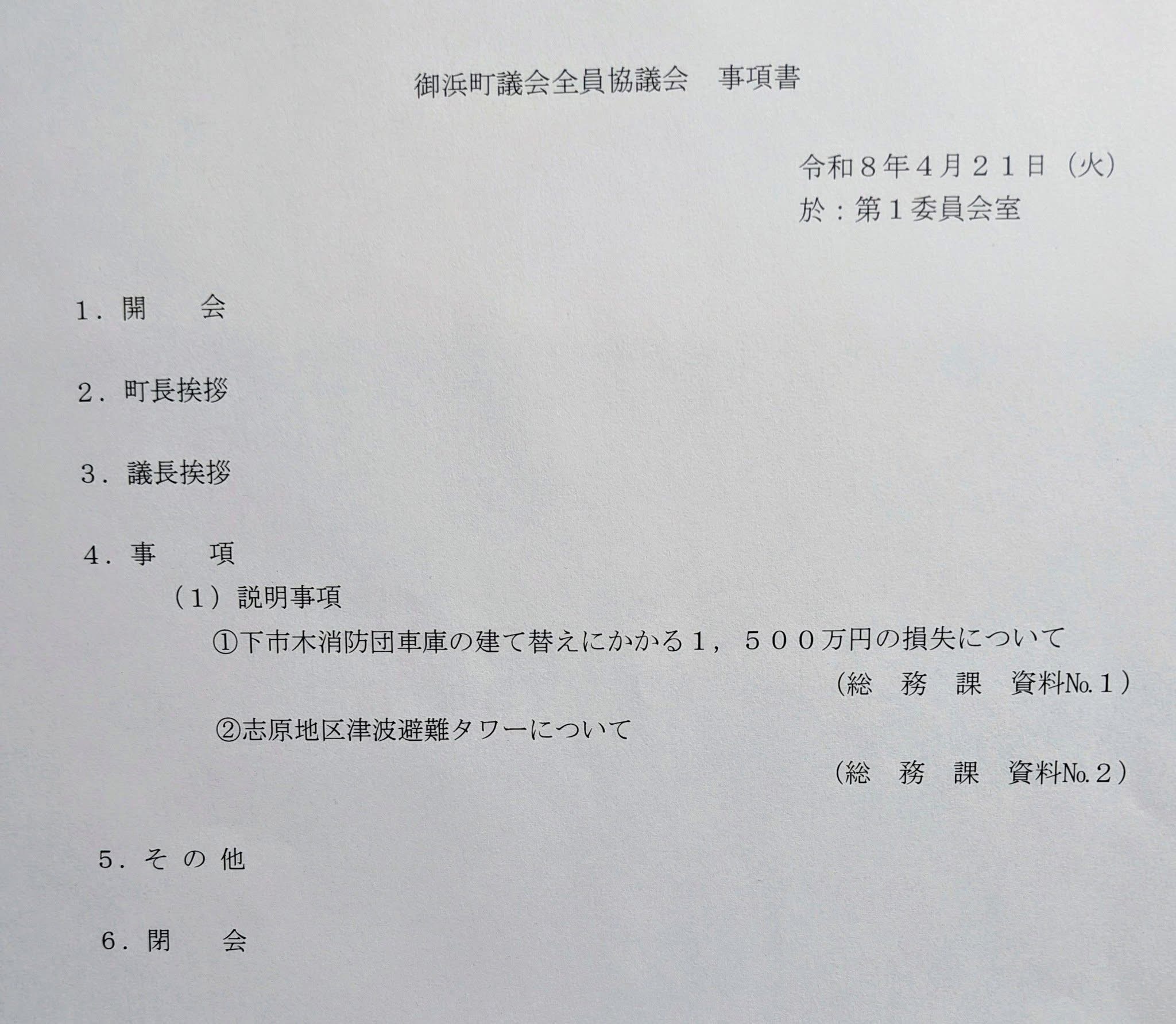令和8年(2026)4月21日(火)午前9時から開催された御浜町議会全員協議会