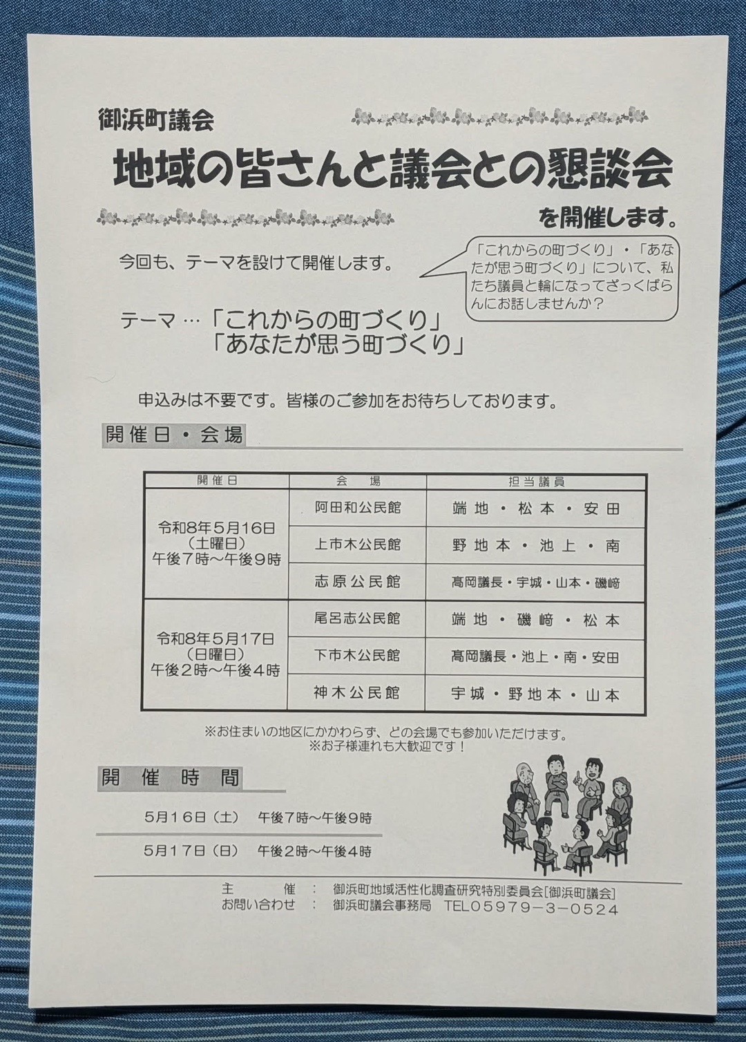 ホーム>政党・政治家>山本 あきひこ (ヤマモト アキヒコ)>【御浜町】「地域の皆さんと議会との懇談会」 開催のご案内
