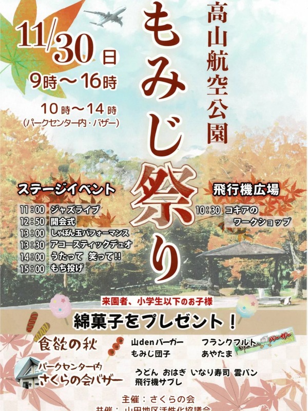 明日(11月30日)は高山航空公園のもみじ祭り! 山田活性化協議会の山denバーガー他、多数。