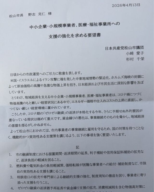 先日4月13日、松山市に対し、物価高騰と資金繰りに苦しむ市内事業者を守るための「緊急要望書」を提出いたしました。