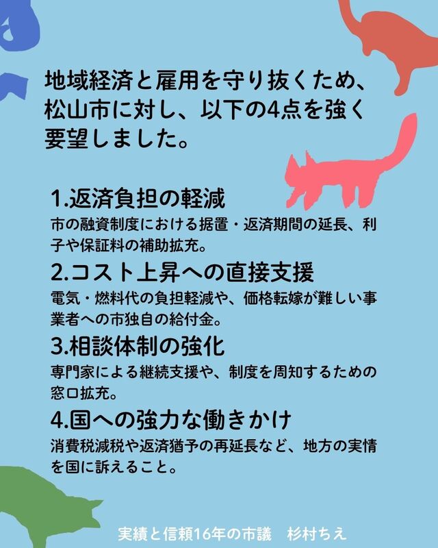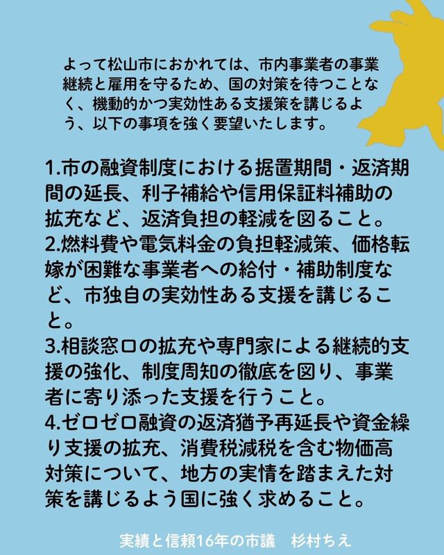 事業者の皆様が安心して経営を続けられるよう、これからも松山市、そして国へ対し実効性のある対策を求めて全力で動いてまいります!