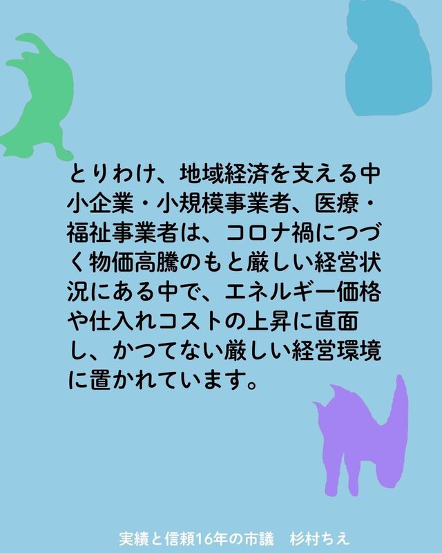 今、松山の地域経済の主役である中小企業や、市民の生活を支える医療・福祉事業所は、これまでにない厳しい状況に置かれています。
