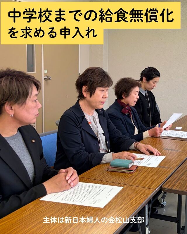 先日4月13日、新日本婦人の会松山市部の皆様とともに、松山市へ「中学校までの学校給食費の完全無償化」を求める申し入れを行いました。