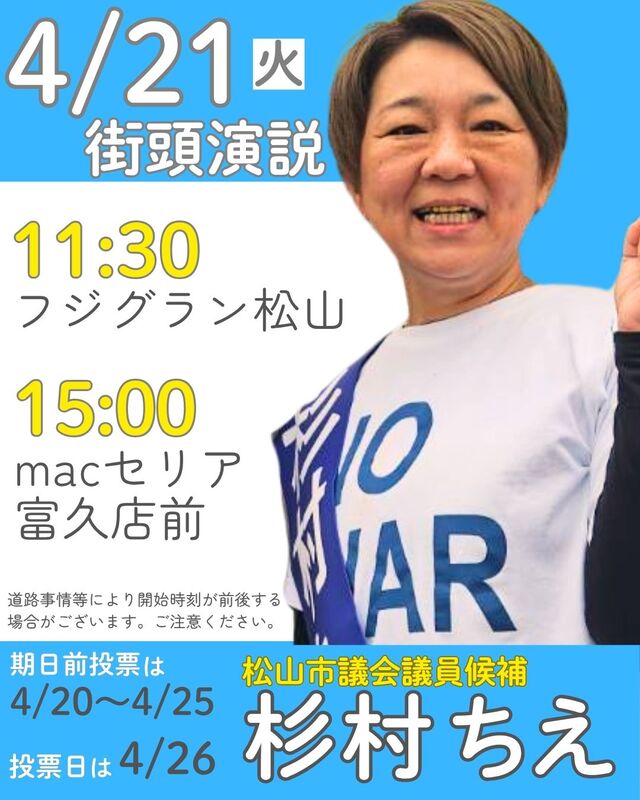 ホーム>政党・政治家>杉村 ちえ (スギムラ チエ)>【4月21日(火曜日)の街頭演説予定】あなたの町に伺います。