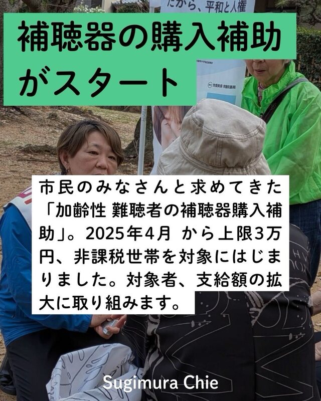 誰にでも起こりえる「加齢性難聴」。補聴器購入補助は市民の皆さんと一緒に求めてきたことで、2025年にやっと制度がスタートしました。 ですが対象者はまだ限定的なため、引き続き対象者拡大を訴えていきます。