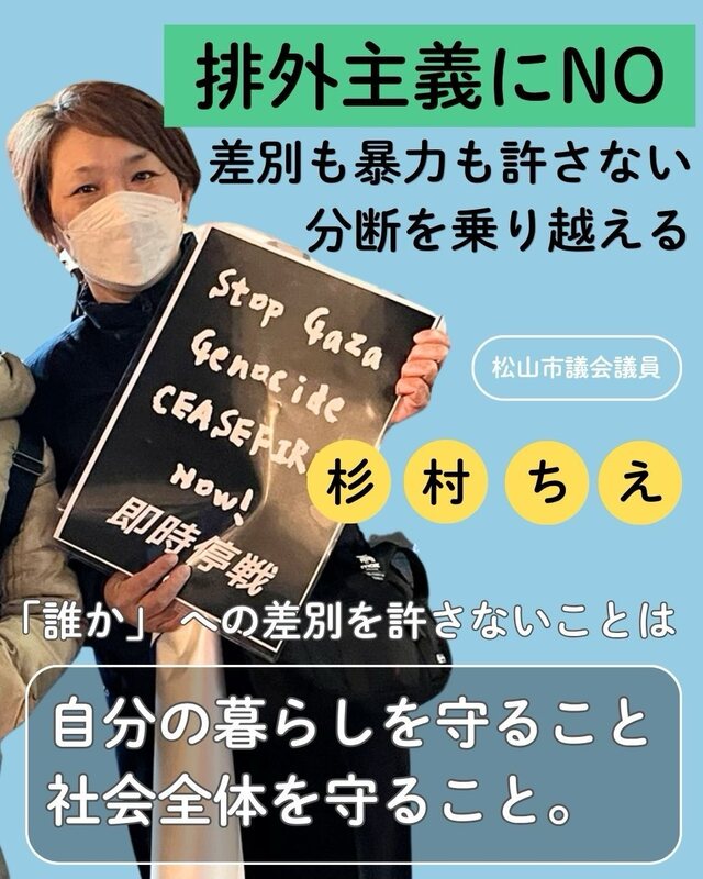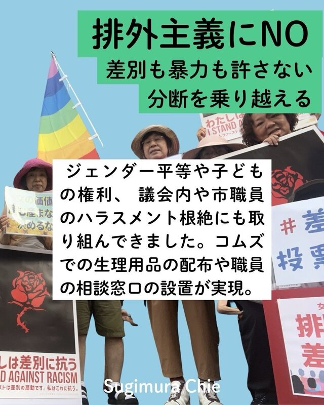 「誰か」への差別を許さないことは、自分の暮らしを守ることにつながる。それは社会全体を守ることになる。 排外主義にきっぱりNOを。 差別も暴力も許さず、ジェンダー平等、子供の権利、ハラスメントの根絶にも今後も向き合います。