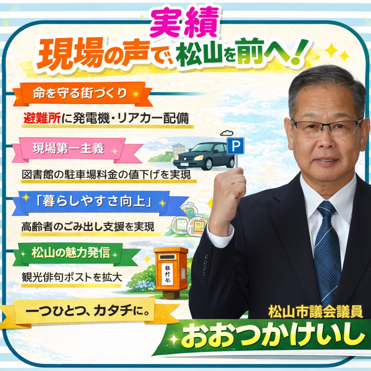 ホーム>政党・政治家>大塚 啓史 (オオツカ ケイシ)>【松山市議会議員候補・おおつかけいし】実績