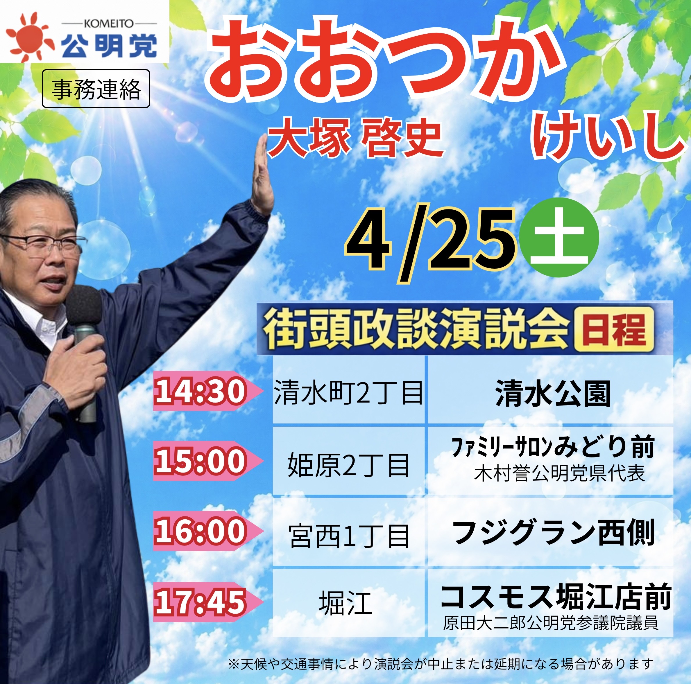 おおつかけいしです!!4月25日松山市内、4か所で街頭政談演説会をさせていただきます。