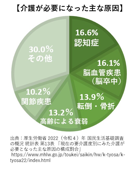 介護が始まるきっかけの多くは、ある日突然やってきます。令和4年の国民生活基礎調査によると、介護が必要になった主な原因は下の円グラフの通りです。これらは年を取れば誰にでも起こる病気です。日本では高齢化が進み、2024年度には65歳以上がすでに人口の約3割を占めています※1。