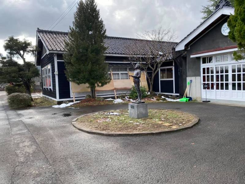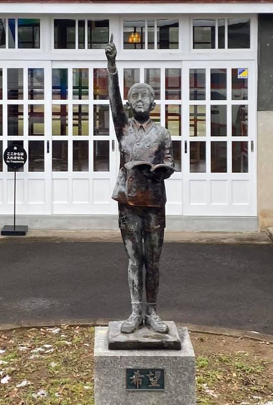小学校の銅像は「二宮金次郎」が多く見ますが、こちらは校舎の前に「希望」と書かれ、まっすぐに指を高く上に掲げている子どもの銅像がありました。