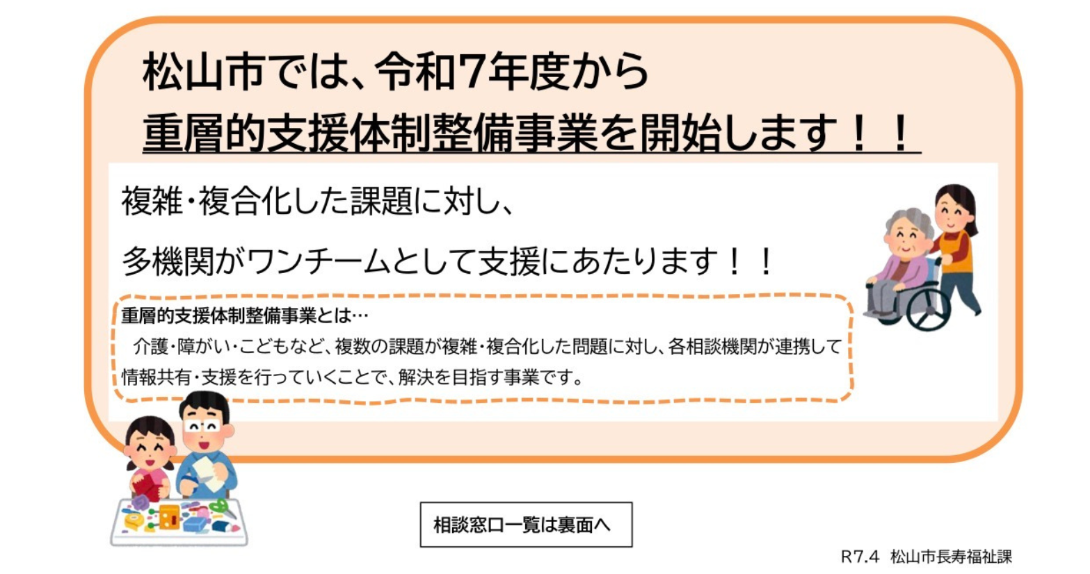 松山市は、こうした取り組みをもとに、国の制度である「重層的支援体制整備事業」の実施に向けた検討を進めて、令和7年4月より実施されることになりました。