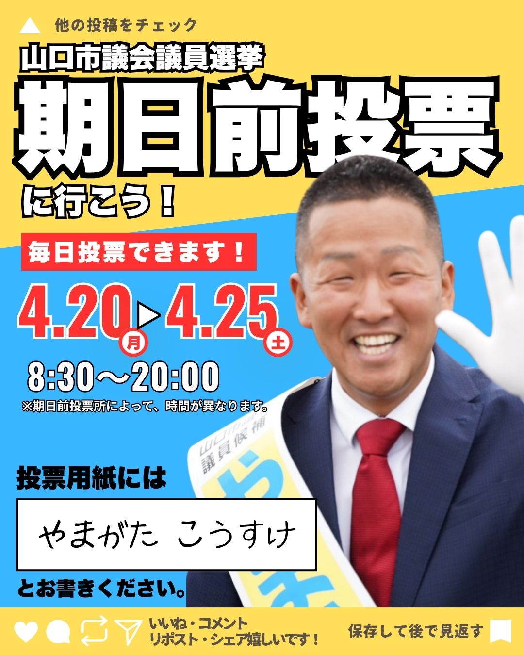 ホーム>政党・政治家>やまがた こうすけ (ヤマガタ コウスケ)>【選挙戦中盤】山口市議会議員選挙、期日前投票が始まっています!