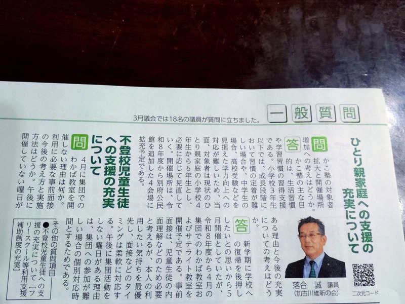加古川市議会議員の落合誠です。 3月議会で一般質問したひとり親家庭支援と不登校児童生徒支援についての内容が議会だよりに掲載されました。 是非、ご覧ください。