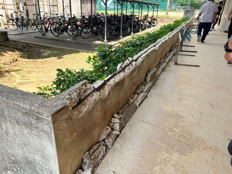 続いて視察した石垣中学校は、校舎が築45年以上を経過しており、各所で老朽化が進んでいました。昨年度は一部校舎の壁面修繕などに約2,000万円をかけて対応していますが、建物全体が古いため、修繕が追いついていない状況も見受けられました。その中でも、生徒の安全確保に関わる箇所については、優先的に対応が行われています。
