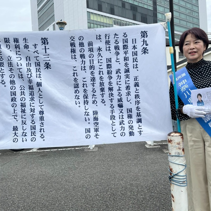 新横浜駅篠原口で宣伝しました。ガードレールの縦棒の位置に合わせて発注された憲法幕の前で。憲法の生きる平和な社会へ。