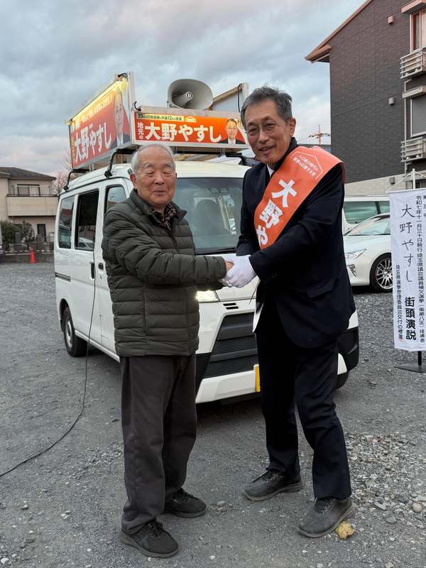 ホーム>政党・政治家>大野 やすし (オオノ ヤスシ)>【11月29日県議補選第9日】最終日は、宮本町、神明町の最終日の挨拶から始まり、北越谷、大沢、...
