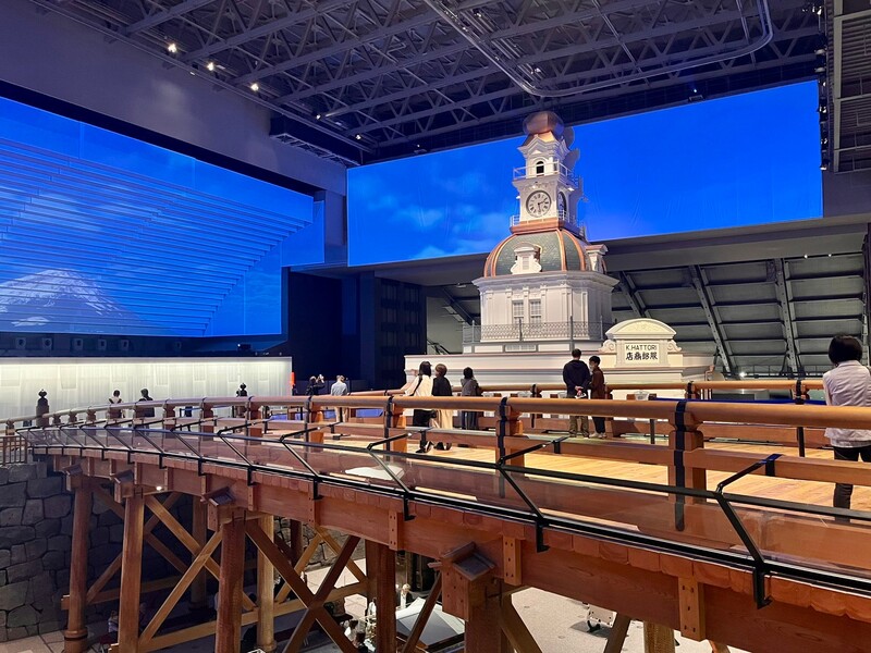 入館すると、右手に銀座和光を眺めながら日本橋を渡り、江戸の世界へ。