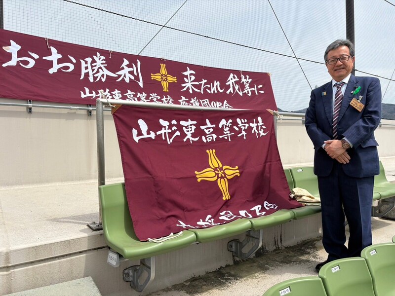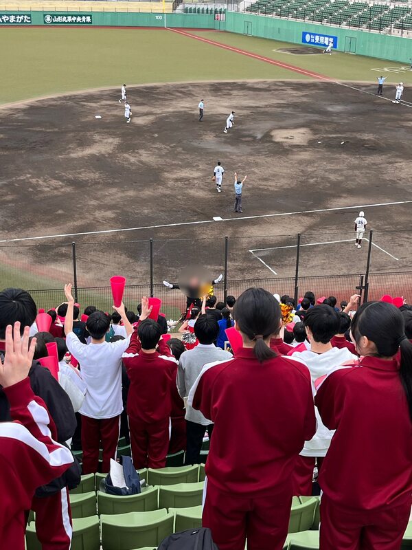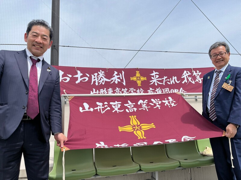 【野球東南定期戦】【山形市】 表題試合を観戦。母校応援団同窓会会長として応援団現役団員諸兄を激励いたしました😊渋間佳寿美副議長と共に。野球部は無論のことですが応援も日頃の鍛錬の成果を充分発揮してくださいませ👏試合の方は今ところ勝っています👏しばらく振りの勝利なるかなぁ。両校とも全力プレーを期待いたします。