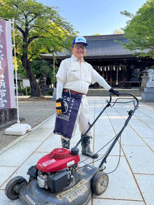 【神社清掃🧹】【山形市】 おはようございます😃雲一つない青空の日曜朝。崇敬する神社の清掃活躍に参加。所属する神輿会の一員として。所有する芝刈り機持参でしたが途中からからはいつもの刈り払い機にて。皆様お疲れ様でした😊