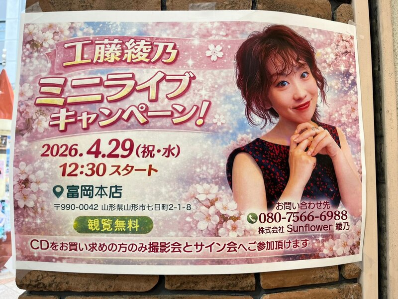 【推し活?】【#工藤綾乃】【山形市】 山形市出身の歌手🎤工藤綾乃さんのミニライブを観賞😊市内富岡本店にて。本日地元は祭典日につき私もお祭り気分。スキマ時間の「推し活」に大満足😊CD購入してサインとツーショットをゲット👏👏綾乃さんの益々のご活躍に期待します。