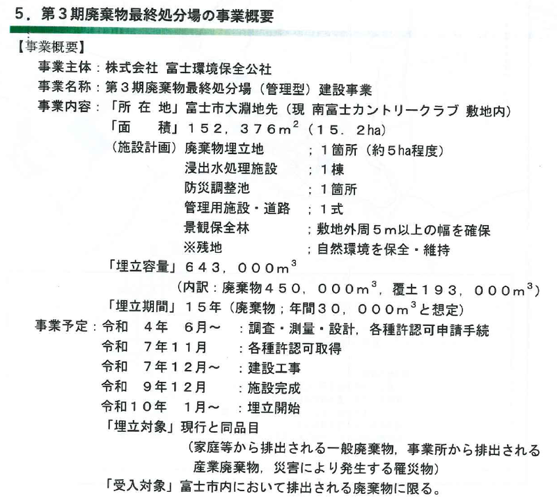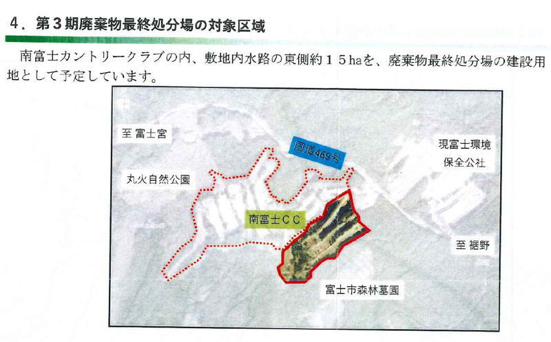 事業概要については新聞報道の通りで、南富士ゴルフ場跡地のうち約15haを購入し、第3期産業廃棄物最終処分場(管理型)を建設するというもの。