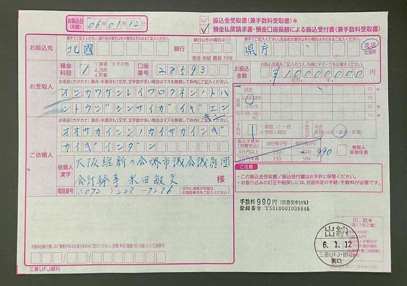 能登半島地震により被災された皆さまへお見舞い申し上げるとともに早い復興をお祈りします。 今回、大阪維新の会堺市議会議員団から身を切る改革で積み立てていた1000万円を寄付させていただきました。