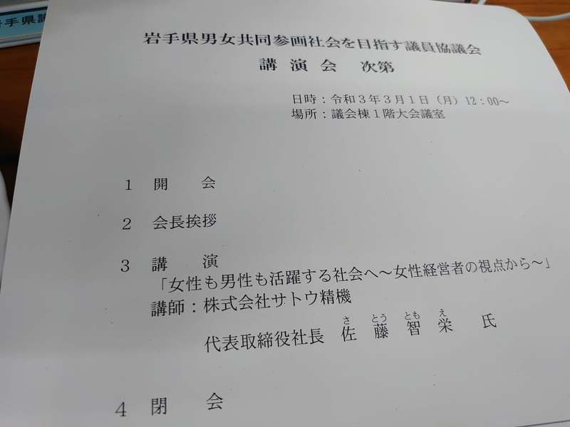 昨日は『岩手県議会男女共同参画社会を目指す議員協議会』研修会の講師として、地元花巻市の株式会社サトウ精機の代表取締役社長、佐藤智栄氏が登場!