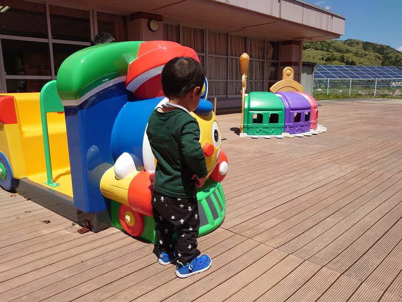 世界は広い、世の中甘くないぞ、鼻っ柱へし折られて来いや!と、意気込んで送り出したつもりでしたが、園長先生が次々繰り出す歌や手遊びにも我関せず。マイペースに1人、中庭にある大好きな乗り物の遊具と戯れるのでした。