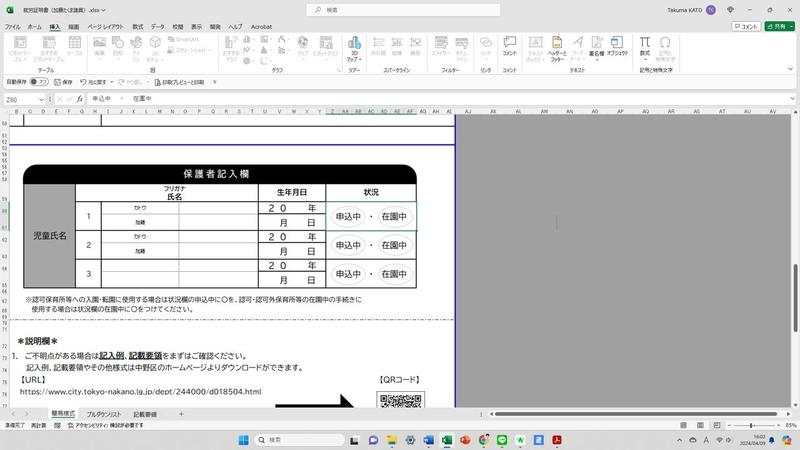 今年度より、#就労証明書 のEXCELファイルをHPからDL可能となるも、最後の「保護者記入欄」の状況(申込中・在園中)に〇をしようにも図形コマンドがプロテクトされ、書類を完成できなかった。