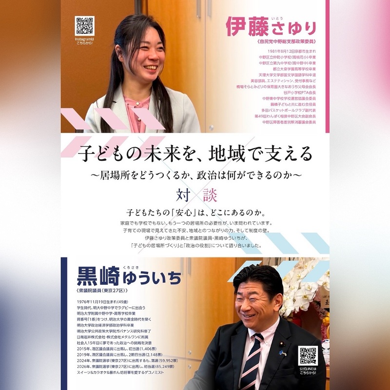 ホーム>政党・政治家>黒崎 ゆういち (クロサキ ユウイチ)>中野で育ち現在は子育て中でPTA会長も務めらている伊藤さゆり中野総支部政策委員と対談をさせてい...
