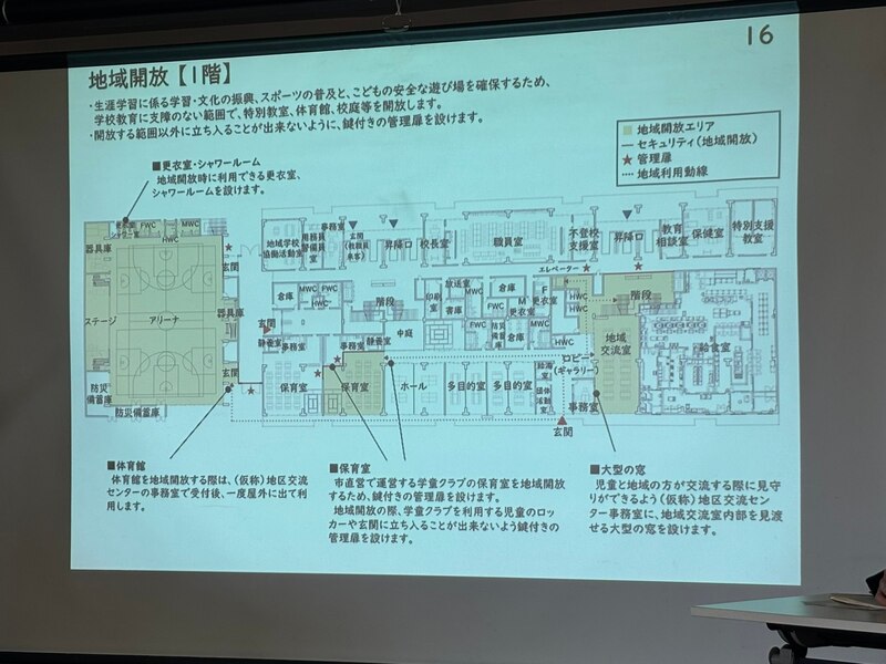 説明を聞いていてセキュリティーや導線がどうなるかわからず気になるのと 音楽、算数、家庭科、図書室も地域解放の対象が既存の利用率を前提にしていますが 利用率の説明はなく地域センターと公民館の部屋数は廃止・統合後減少するとのことです。