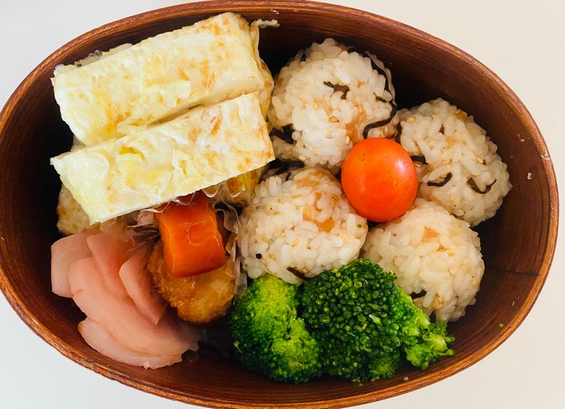 平飼いたまごで作った出汁巻きメンイのシンプルお弁当。残せるようにおにぎりにしました。