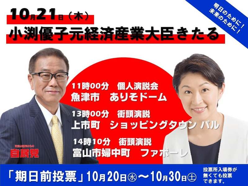 【小渕優子 演説会】 上田英俊さんの応援のために小渕優子さんが来富されます! ぜひお話を聞いてください。m(_ _)m